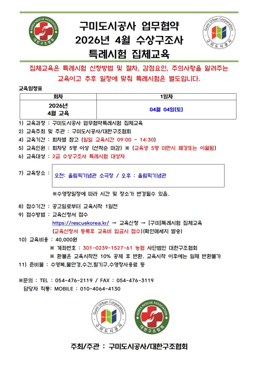 구미도시공사 업무협약 2026년 4월 수상구조사 특례시험 집체교육
