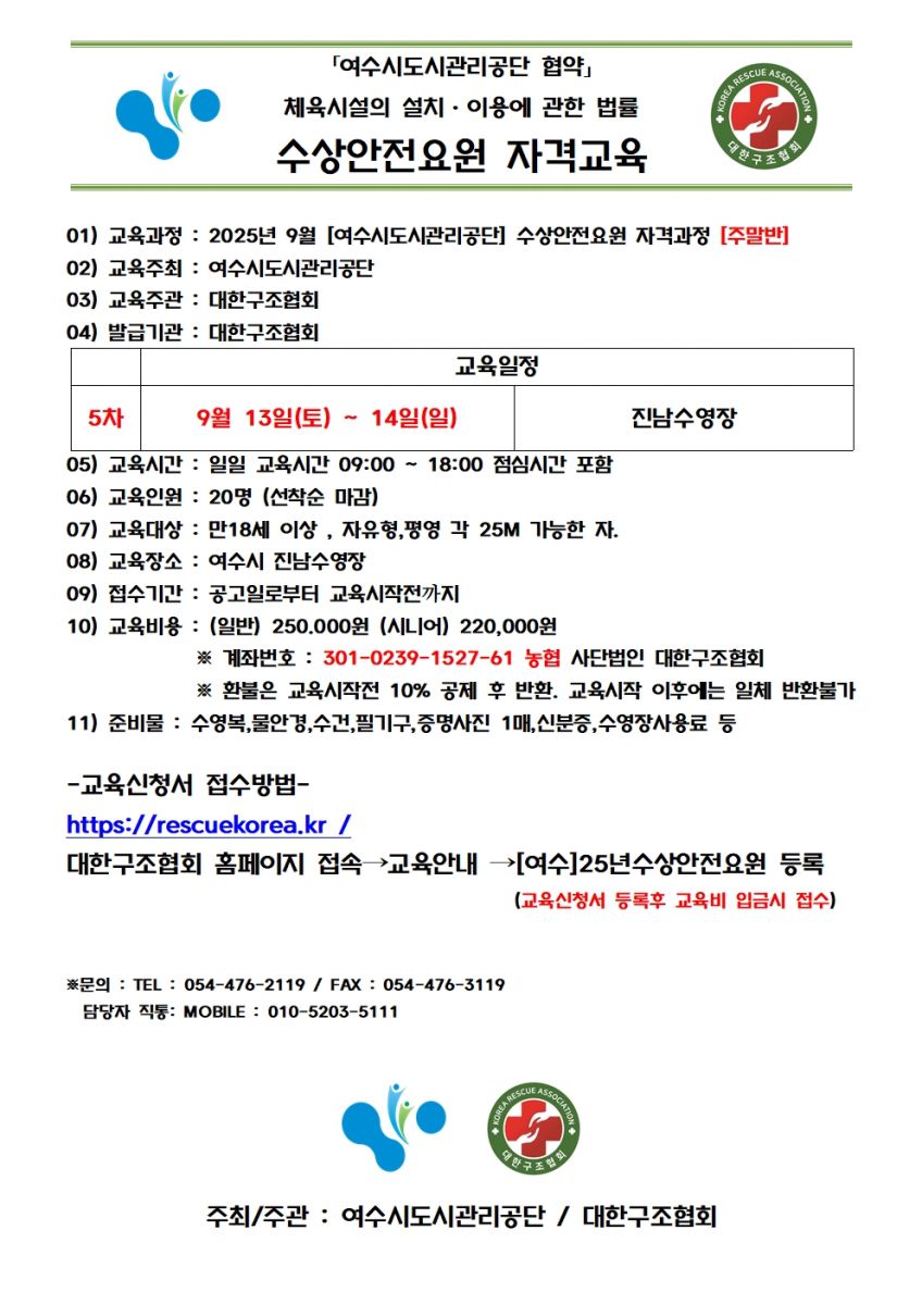 [여수시도시관리공단] 25년 5차 수상안전요원 자격교육