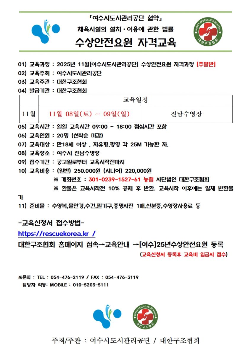 [폐강] [여수시도시관리공단] 25년 11월 수상안전요원 자격교육