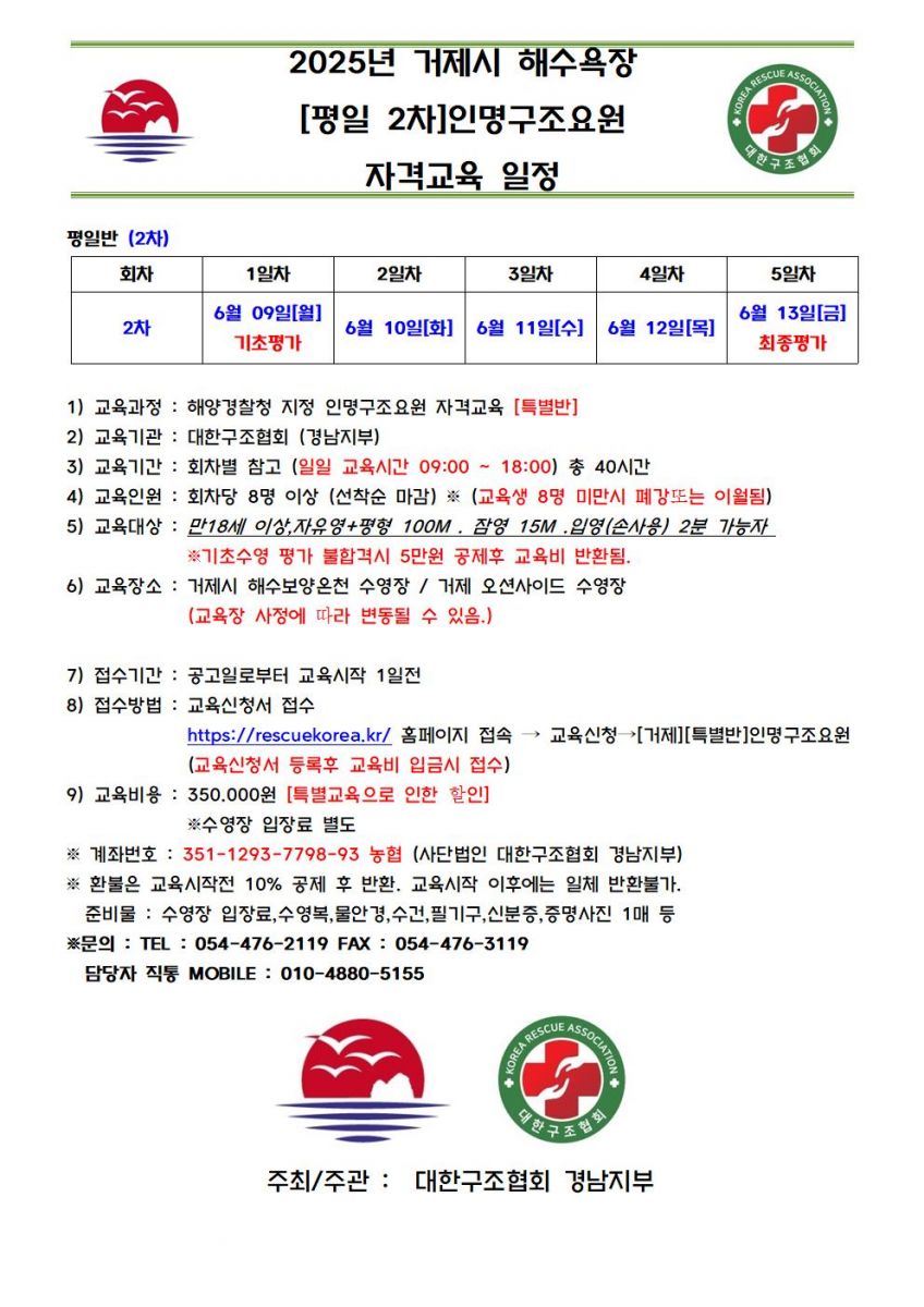 [폐강][거제][특별교육]2025년 해수욕장 평일반 1차 인명구조요원 신규